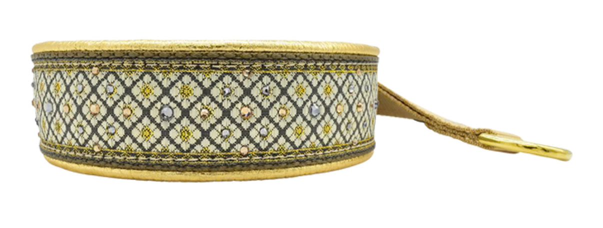 Inspired by classic romance and noble charm, the Capulet collar blends refined design with modern durability. Featuring jacquard ribbon sewn onto reliable nylon webbing and available in six different colorways, Capulet has intricate, Italian-styled flourishes, metallic threads, and Luxe European crystals. This collar is made for dogs with hearts as bold as their style.